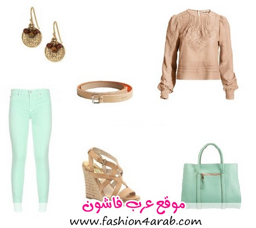 بلوزة باللون الكريمى مع بنطلون جينز اخضر مع وجود حزام من نفس اللون الكريمى والجزاء ايضا نفس اللون ولكن الحقيبه خضراء ولا تكثرين من الاكسسوار فيكون رقيق وقليل سوف تلاحظين جمال ورقه التركيبه