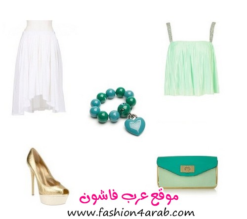 فى هذا الصيف 2013 اصبح الموضه القماش الحرير او الشيفون فيمكنك جمع الفكرتين مع وجود جيبه بيضاء من الحرير او الشيفون مع بلوزة خضراء وحقيبه خضراء وجزاء ذو كعب عالى من اللون الذهبى واكسسوار رقيق اخضر ايضا وهذا يتناسب للسهرا والنزول اليلى وسوف تبدونى اميرة بهذا