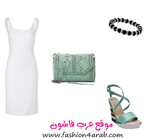 فستان اللون الابيض مع الحقيبه من اللون الاخضر وزوج من الصندال نفس اللون و إضافة قطعة جميلة من الاكسسوارات سوف يكون انيق وجذاب للغايه وهذا التركيبه من الالوان تلايق بالصيف والربيع